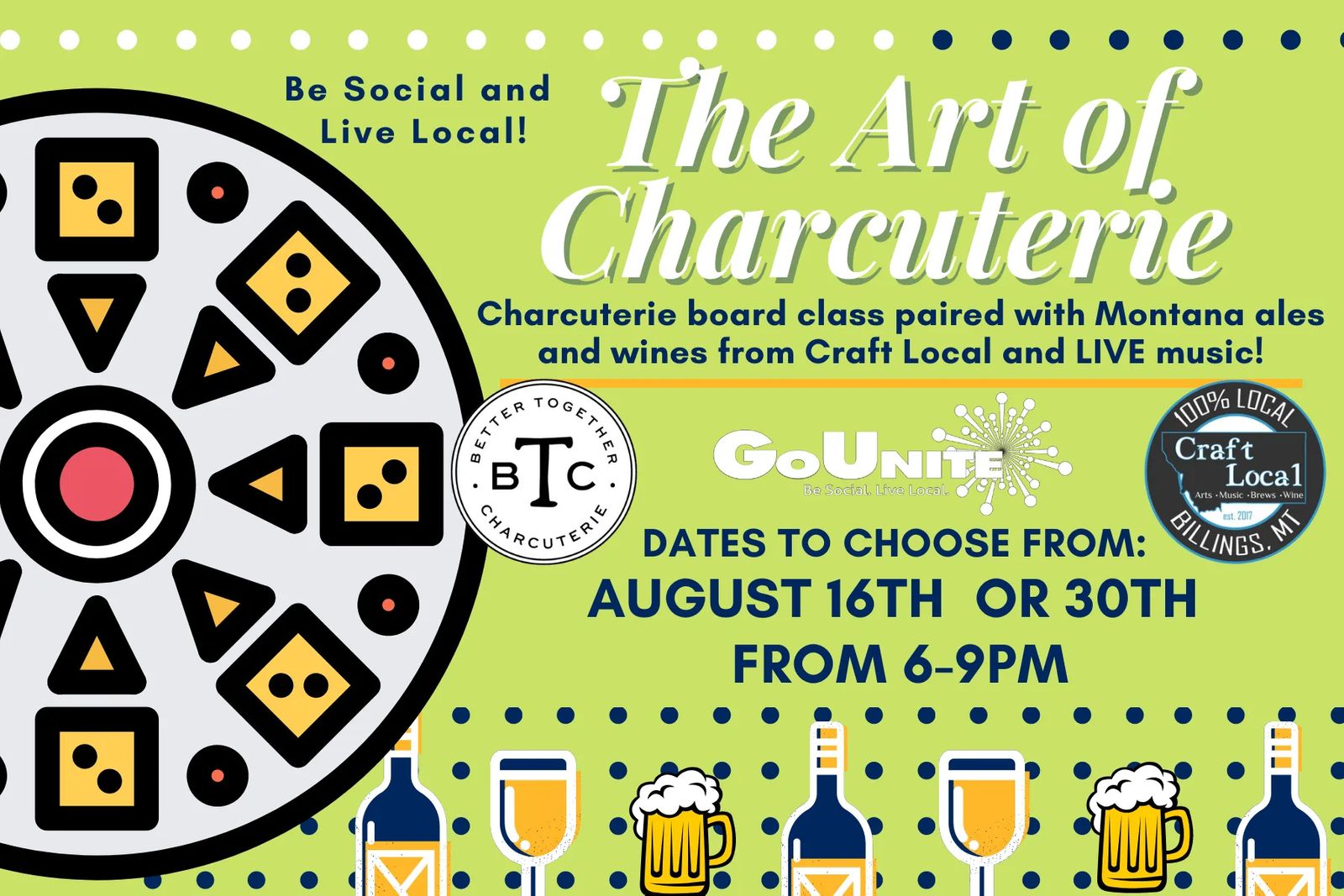 Join us at Craft Local for an instructed charcuterie board class with Better Together Charcuterie. Learn how to perfectly pair meats & cheeses together while enjoying local Montana made brews and wines. We will wrap up the evening enjoying our boards with LIVE music from Jessica Allestad!
