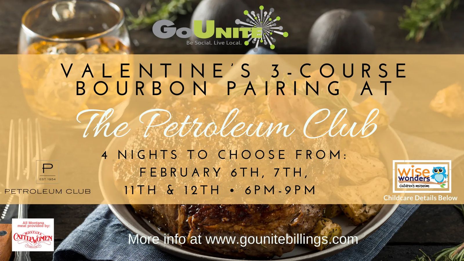 Join us for a unique, early Valentine's event at The Petroleum Club! Enjoy a 3-course bourbon pairing high above Billings, surrounded by breathtaking views atop the Double Tree.