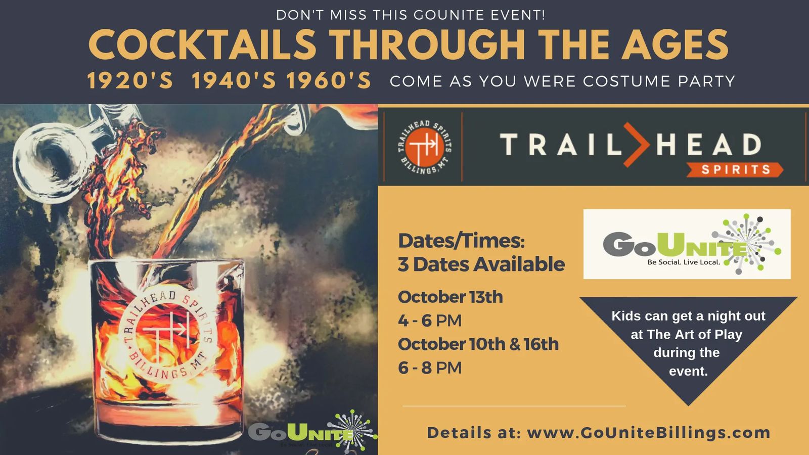 Come take a walk through history as the brilliant minds at Trailhead Spirits serve up some iconic drinks from past decades. We will enjoy 3 separate drinks that were popular in the 20’s, 40’s & 60’s. Each drink will also be paired with popular foods from those eras! In full October spirit, feel free to come dressed in costume from one of those decades as well! Bring on the flapper dresses, golf knickers & argyle socks, plaid a-line skirts, wide-leg pants & tie-dye shirts!